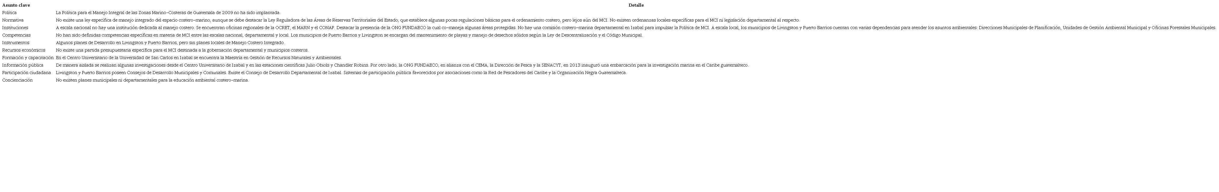 A escala subnacional, según SEGEPLAN (2011), en materia legal medioambiental, el departamento de Izabal y sus autoridades no cuentan con sistemas de control eficientes para la aplicación de normas destinadas al manejo de desechos sólidos, vertidos, etc. En la PMIZMC se planteó la necesidad de presupuestos para que de manera descentralizada las municipalidades a través de los Consejos Comunitarios de Desarrollo y los municipales mejoren sus actuaciones en la zona costero-marina. La no implantación de la Política aplazó la incorporación del enfoque del MCI en la definición de responsabilidades entre las instituciones y, por tanto, de respuestas efectivas a los complejos problemas también en el área de estudio.