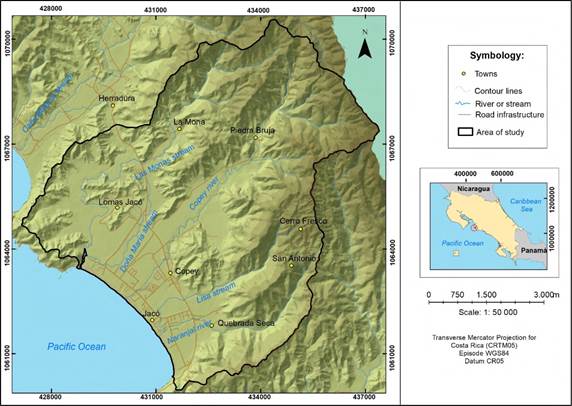 The study area, of 47.5 km2, is located in the coastal city of Jacó, in the municipality of Garabito in the province of Puntarenas, on the Central Pacific Coast of Costa Rica, between coordinates 9° 35' 52.17" and 9° 41' 17.24" north latitude, and 84° 34' 26.90" and 84° 39' 22.79" west longitude, according to the WGS84 coordinate system (Figure 1). It is composed of three micro-basins that belong to the La Mona stream and the Copey and Naranjal rivers. It has an altitude range between 0 and 750 m.a.s.l. and an average annual precipitation of 3 600 mm, with a peak in the months ranging from September to October (Solano and Villalobos, 2001).