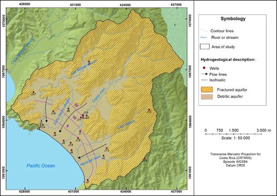 The coastal aquifer of Jacó is composed of two types of materials. In the alluvial plain, the aquifer is unconfined and is housed in unconsolidated alluvial and colluvial materials and, thus, detritic (SENARA, 2002, Gómez-Cruz et al., 2019). In the hills, the water transits through fractured basaltic and sedimentary rocks and then heads towards the alluvial plain of the study area and, probably, integrates with the groundwater of the unconsolidated formation due to the absence of an impermeable separating barrier layer, thus uniting and becoming a single aquifer (Gómez-Cruz et al., 2019). The recharge in the alluvial plain can be produced by direct infiltration of rainfall (SENARA, 2002), by lateral contribution from the hills, and from influent rivers, in sections where the rivers provide water to the aquifer (Gómez-Cruz et al., 2019).