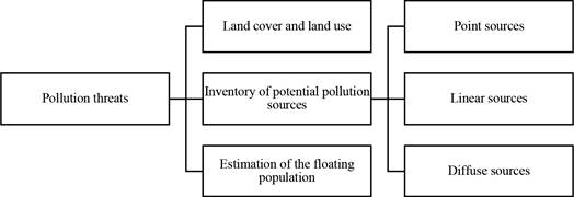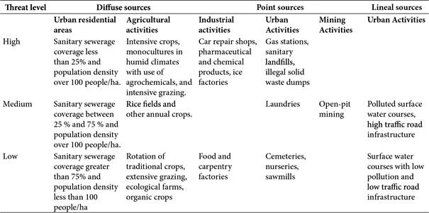 (Methodology): An inventory of potential pollution sources was carried out through the location of human/anthropogenic activities. Potential point, diffuse and linear sources were classified based on the Pollutant Origin Surcharge Hydraulically (POSH) method, as activities with high, medium and low potential generating pollutant load (threat)