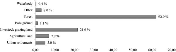 Forest use (i.e., native forests, bushland and teak plantations) represented 62.0 % of the study area (Figure 4). Native forest covered most of the area, representing 55 % of the total area. It was found mainly in the northern and eastern areas of the watershed, where the fractured aquifer is located.