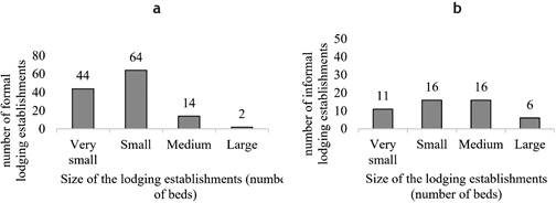 The total number of formal lodging establishments in the study area was approximately 124, while 49 establishments were identified as informal. For each lodging establishment, the number of available beds was obtained, resulting in an estimated total of approximately 12 230 available beds for tourists. Of these, some 5 700 beds were estimated as belonging to formal establishments, while a little over 6 500 were contributed by the informal sector. Of the total lodging establishments identified in the study area, a little more than 50 % correspond to small establishments (between 26 and 75 beds), 35 % to very small (between 1 and 25 beds), and 11 % to medium sized (between 76 and 300 beds). Of these, only two hotels have more than 300 beds (Figure 7a). With respect to wastewater disposal, only 10 establishments have a treatment plant and the rest (114) use septic tanks-leach field systems.