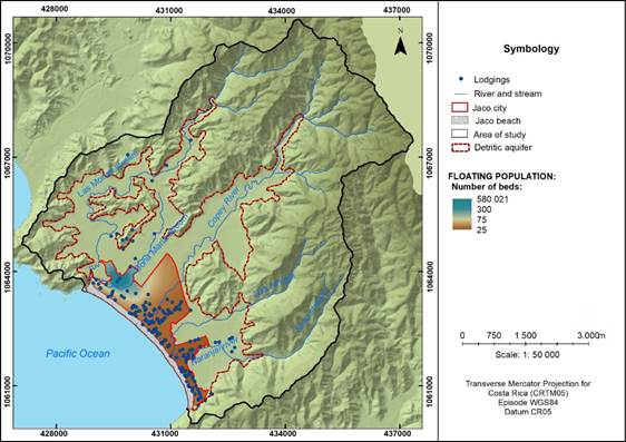 In coastal areas such as Jacó, with constantly growing, year-round tourism activity, the evaluation of the floating population and its possible impacts on the quality and quantity of groundwater consumed is highly recommended. In this case, the floating population doubles the base resident (permanent) population during the high season, and therefore, it is important to have a public policy directed towards urban planning and land management instruments, to improve the living conditions of the population and promote a sustainable tourism industry with a low water footprint.