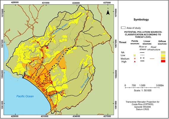 Figure 9 shows the potential sources of diffuse, point and linear contamination, constituting the contamination threat map. The sources of high and medium threat were located mainly in the urban area of the city of Jacó, south of the basin, while the sources of low and NA threat were located north, in areas dedicated to forest cover and pastures. High threat point and linear sources of pollution were found within the urban center and surrounding areas.