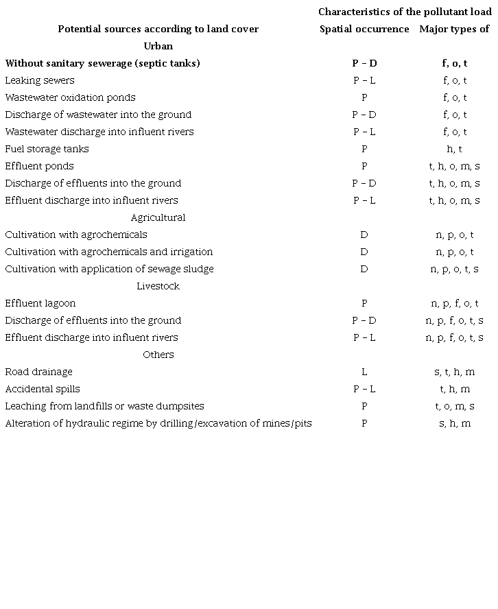 Potential sources were also classified, according to the POSH method, based on their spatial occurrence (Foster et al., 2003), into: a) point sources, which produce clearly defined and more concentrated contamination plumes (e.g. effluent lagoons, solid waste disposal sites, gas stations, mining activities and cemeteries); b) diffuse sources of contamination, which impact a much larger area and volume of the aquifer, e.g. urban areas without sanitary sewerage and centralized treatment, use of septic tank-leach field systems and agricultural activities and; c) linear sources, e.g. roads, where gasoline or oil spills may occur, irrigation channels and influent contaminated rivers and streams (Table 2).