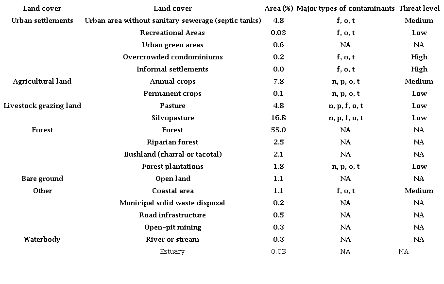 Diffuse pollution sources were related to land cover and land uses, so their counts are represented in percentages and each land use is classified into a threat category (level) according to the characteristic of its pollutant load. According to Table 4, most of the study area was classified as NA to designate those land uses that do not contain point sources with contaminating loads, which indicates the importance of forest cover in the area. The areas classified as low threat represented 23.6 % of the study area, wherein pastures and silvopastures comprise the majority. Medium threat represented 13.6 %, which included the categories of annual crops and urban areas (Table 4). Rice cultivation was the most extensive among agricultural activities in this category.