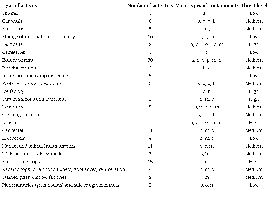 High threat sources were the least frequently identified, however, they represent critical pollution points. 32 sources (17 %) were identified; of these, 15 corresponded to automobile repair shops located within the urban area of the city, 6 car washes, and 11 car rental shops. In the study area, most of the auto repair shops operate without municipal control or even sanitary permits, so their effluents are mixed with domestic wastewater and disposed via septic tanks (Orozco, 2015). Effluents contain lubricants, paints, and other discarded toxic substances, which can infiltrate and seriously contaminate groundwater (Madrigal-Solís et al., 2014).