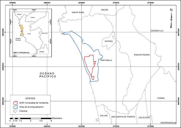El área de estudio comprende el ACR, establecido en 275.49 ha, dentro de lo que fue su zona de amortiguamiento de 996.1 ha, ubicados en la zona centro occidental del distrito de Ventanilla, en la provincia Callao, como se muestra en la Figura 2.
