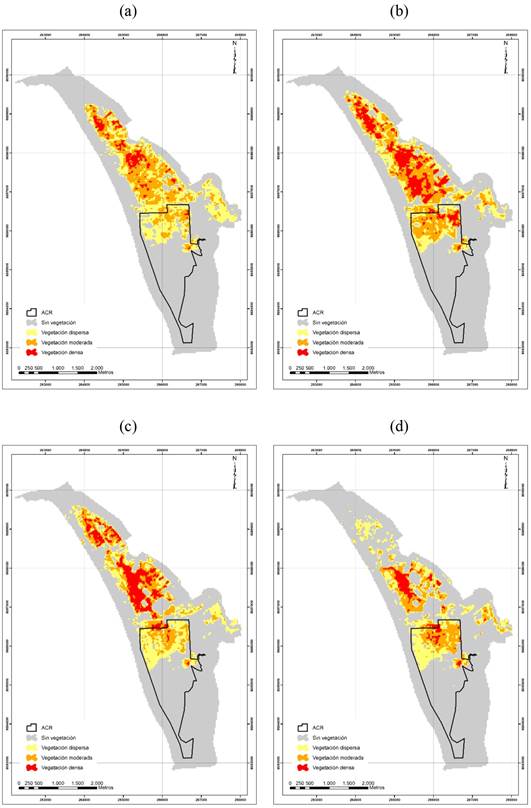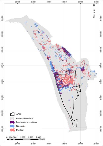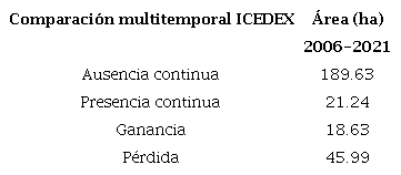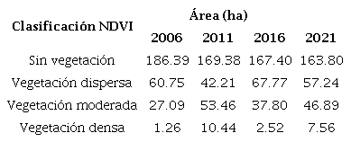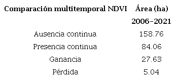 Los cambios de vegetación se presentan en el Cuadro 4, donde se puede observar que hubo un aumento en la vegetación densa y moderada en el último año (6.30 y 19.80 ha, respectivamente) en comparación con el primer año, así como una disminución del suelo sin vegetación y de la vegetación dispersa en el 2021 (22.59 y 3.51 ha, respectivamente) en comparación con el año 2006. En la Figura 3 se presenta la detección de cambios de vegetación de manera espacial en el ACR dentro de su antigua zona de amortiguamiento. Así mismo, en el Cuadro 5 se presenta una comparación multitemporal de la vegetación, únicamente de los años 2006 y 2021, y en la Figura 4 se muestra dicha comparación de manera espacial. Estos resultados reflejan que gran parte de las zonas con vegetación se han mantenido durante los años, que en otras zonas la vegetación ha estado ganando terreno, sobre todo en la zona costera, y que en otras zonas ha estado disminuyendo levemente, mayormente en el extremo noreste del ACR.