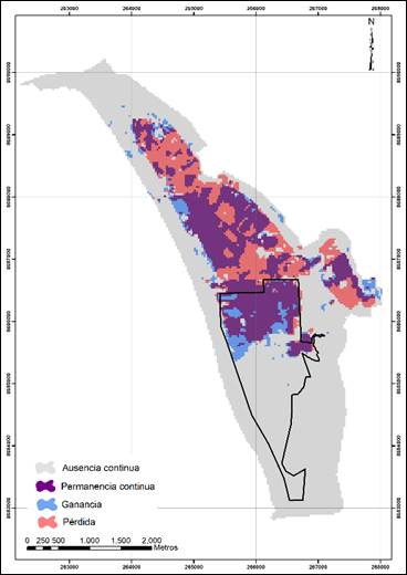(Results): We found that about soil saturation there was a loss of 45.99 ha and a gain of 18.63 ha, the loss was accentuated in the northern zone of the RCA and the gain in the coastal strip, meanwhile for vegetation there was a gain of 27.63 ha and a loss of 5.04 ha, the gain was mainly in the coastal strip and the loss in the limits of the RCA. This evidence a process of eutrophication in the RCA, possibly due to anthropogenic causes, which are the main threats to this ecosystem.