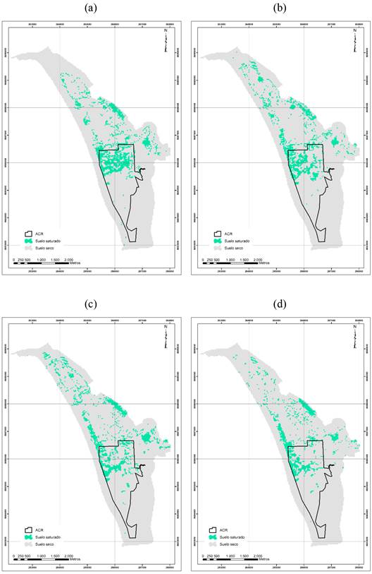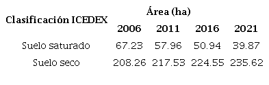 Los cambios en cuanto a la saturación del suelo se encuentran en el Cuadro 6, donde podemos observar que hubo una pérdida de suelos saturados que se refleja en los cuatro años analizados, esta se ha acentuado en el último año de estudio, que en comparación con el primero, tiene una pérdida de 27.36 ha. En la Figura 5 se presenta la detección de cambios de la saturación del suelo de manera espacial en el ACR, dentro de lo que antes era su zona de amortiguamiento. Así mismo, en el Cuadro 7 se presentan una comparación multitemporal de la saturación del suelo, únicamente de los años 2006 y 2021, además, la Figura 6 muestra dicha comparación de manera visual. Estos resultados reflejan que la pérdida de suelos saturados se acentúa en la zona norte del ACR, mientras que los suelos costeros han mantenido su estado de saturación; además, se ha observado que, aunque en general ha habido una pérdida de suelo saturado, en la zona sur del ACR se han generado este tipo de suelos.