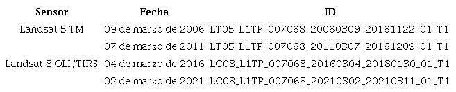 Para la evaluación del ACR se usaron imágenes satelitales de nivel 1 generadas por los sensores TM (Landsat 5) y OLI/TIRS (Landsat 8), como se muestra en el Cuadro 1, las cuales se adquirieron mediante acceso libre del U.S. Geological Survey (USGS). Se decidió trabajar con un intervalo de cinco años entre imágenes para obtener resultados que comparen el estado inicial y final del ACR, además de mostrar los escenarios de cambio entre estos, por lo que el intervalo propuesto se ajusta a esta medida. Además, se priorizó el mes de marzo, ya que al encontrarse el ACR dentro del sistema hídrico del río Chillón puede verse influenciado por las descargas de este, cuyo mayor volumen promedio anual ocurre entre los meses de diciembre y abril (Gobierno Regional del Callao, 2009), lo que generaría un aumento en la cantidad de agua del humedal. Otra razón para optar por este mes es que las imágenes satelitales presentaban menor nubosidad a comparación de otros meses.