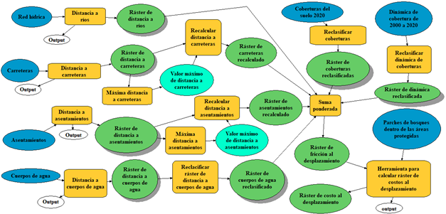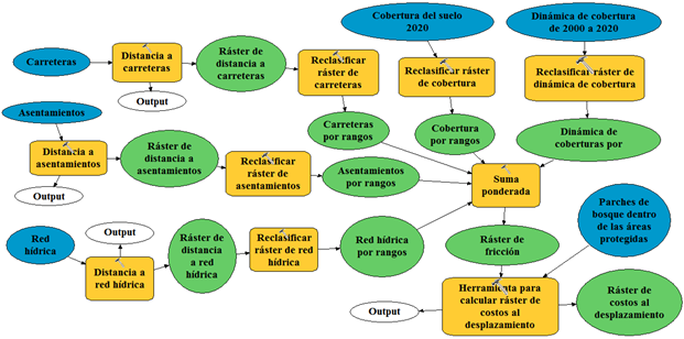 Para el cálculo del ráster de costos al desplazamiento sin rangos, se introdujo un cambio fundamental: la eliminación del paso de reclasificar los componentes de barrera en rangos. Esto se debe al uso de los valores de distancia a los elementos de barrera directamente. En el caso de las carreteras y asentamientos, se consideró que mientras más alejado de estos elementos más factible es la conectividad. Por lo tanto, cada ráster de distancia se restó del máximo valor de distancia correspondiente a este, para obtener el inverso de esas distancias. Para el caso de la red hídrica, se consideró que la presencia de estos elementos es una barrera, por lo que se hizo una reclasificación de 0 para los píxeles con presencia de agua y 10 para los píxeles sin presencia de agua. En la Figura 3 se ilustra el proceso desarrollado en un ambiente de Model Builder de ArcMap, en su versión 10.4.