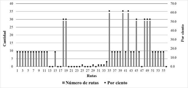 Los análisis de las condiciones altitudinales y longitudinales de las rutas identificadas muestran que un total de 518 rutas sufrieron cambios en su condición, al cambiar la forma de obtener el ráster de costos. Dichas 518 rutas (16.8 % del total identificadas) cambiaron siempre a una condición altitudinal, por lo que el número de rutas altitudinales aumentó en 518, mientras que el número de rutas latitudinales se redujo en ese mismo número. Empleando el método de cálculo del ráster de costos con rangos, la relación entre rutas altitudinales y longitudinales es más homogénea (59 % de rutas altitudinales y 41 % de rutas longitudinales), mientras que con el empleo del método de cálculo de ráster de costos sin rangos esa relación se hace más desequilibrada, a favor de las rutas altitudinales (75.8 % de rutas altitudinales y 24.2 % de rutas longitudinales).