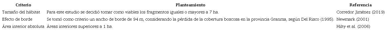 Un aspecto ciertamente novedoso en la investigación es la evaluación de la conectividad a partir de fragmentos de bosques considerados viables al interior de las ANP y no a partir de los bordes externos de estas, como tradicionalmente se hace. Esta decisión se tomó con base en que pueden existir fragmentos de coberturas al interior de las ANP, y cercano a los bordes de estas, que se correspondan con usos no factibles para garantizar la conectividad o el desplazamiento natural de las especies. Los aspectos considerados para declarar viable un fragmento de bosque se establecieron siguiendo criterios de autores como Kattan (2002) y se presentan en el Cuadro 1.