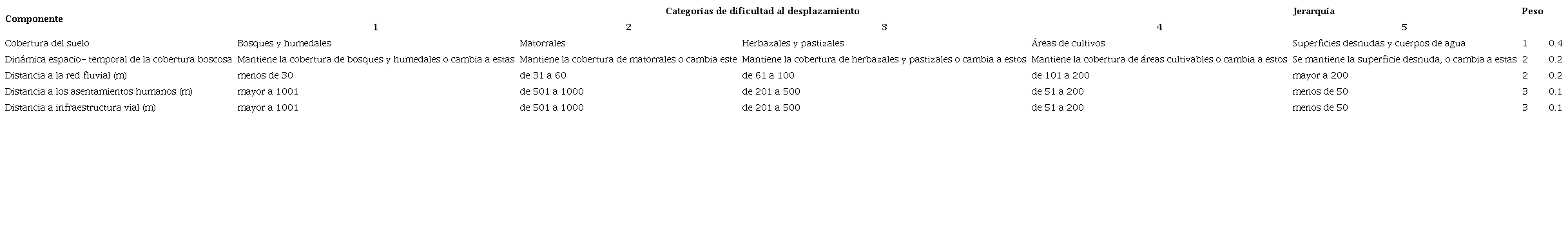 Para la evaluación de estos criterios y generar el mapa de fricción, por el método de los rangos, se establecieron rangos y pesos para ponderar su comportamiento al desplazamiento de las especies en el territorio. Dichos rangos y pesos se determinaron con base en la escala ordinal y método de clasificación ya usado por Ramón Puebla et al. (2020). Los criterios de clasificación obtenidos a partir de este método, la jerarquía, el peso y la ponderación de cada componente, se presentan en el Cuadro 2.