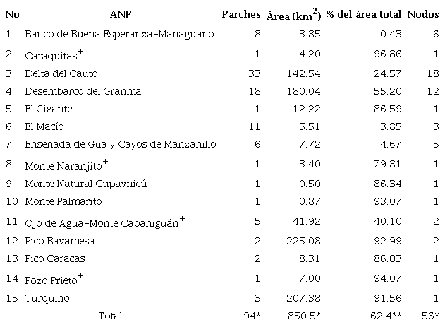 El Cuadro 3 muestra la distribución de parches y nodos por ANP, donde llama la atención que el 32 % de los nodos se concentran en una sola ANP, Delta del Cauto; mientras que ocho (8) ANP presentan solamente un (1) nodo derivado de parches de vegetación natural viable para la conectividad. En cinco de esas ocho ANP con un único nodo, los parches correspondientes a esos nodos ocupan más del 90 % del territorio del ANP, lo que resalta la importancia de los parches de vegetación en la conectividad de dichas ANP, al ser el único parche de vegetación viable a la conectividad.