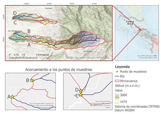 El estudio se realizó entre febrero de 2017 y marzo de 2018 en cuatro microcuencas. Los puntos de muestreo se ubicaron en cada río, antes de la entrada a la zona de cribado correspondiente a cada una de las cuatro captaciones de un sistema de abastecimiento de agua para consumo humano, ubicado al este del Gran Área Metropolitana de Costa Rica (Figura 1). Este sistema fue seleccionado debido a que abastece aproximadamente 70 000 personas (1.4 % de la población costarricense). Se encuentra ubicado en la parte alta de la cuenca del Río Grande de Tárcoles, en las provincias de San José y Cartago. Es importante indicar que, en este sistema particular, las captaciones se encuentran varios kilómetros corrientes abajo de la naciente y que los puntos de muestreo se establecieron como punto de menor altitud en cada microcuenca. La zona de estudio se clasifica bioclimáticamente como bosque muy húmedo montano bajo, con excepción de la parte alta de la microcuenca A, clasificada como bosque pluvial montano. El suelo es tipo andisol, el cual se caracteriza por su alta permeabilidad. La clasificación bioclimática y de suelos fue realizada con la superposición de capas vectoriales provenientes del Atlas de Costa Rica (Ortiz-Malavasi, 2014).