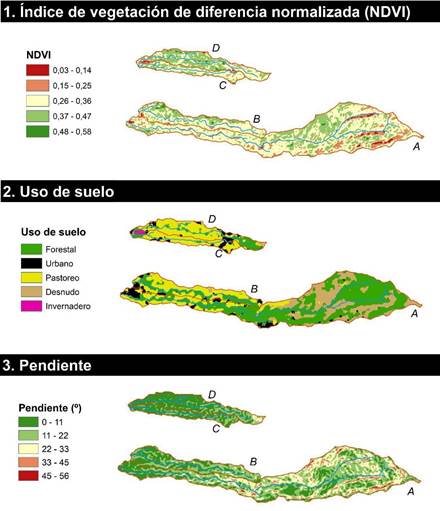 Con respecto al uso de suelo, al uso forestal corresponde la mayor área (40.59 %), seguido del pastoril (27.22 %), desnudo (20.97 %) y urbano (11.22 %); el uso menos frecuente son los invernaderos (0.01 %). Se observa que la mayor predominancia de uso forestal y suelo desnudo se encuentra en la microcuenca A y la mayor predominancia de uso pastoril se encuentra en las microcuencas C y D. Las zonas urbanas en las microcuencas A y B se ubican en la parte baja y, en las zonas C y D, en la parte alta. En general, los datos de densidad de vegetación y uso de suelo clasifican la zona de estudio como rural con actividades predominantemente ganaderas y parches urbanos heterogéneamente distribuidos.