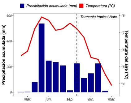 Durante el periodo en estudio (entre febrero de 2017 a marzo de 2018), la precipitación anual promedio fue de 5.1 mm, oscilando entre 0.00-71.20 mm y la temperatura promedio diaria fue de 16.4 º C, con una variación entre 7.65-24.11 º C. Tanto la precipitación como la temperatura se encuentran en el ámbito esperado para la región (IMN, 2015). El mes de mayo de 2017 presentó la máxima de precipitación y la máxima de temperatura promedio del periodo de estudio (Figura 3). La precipitación acumulada fue de 2057 mm/año, que se encuentra dentro del rango esperado para zonas bioclimáticas clasificadas como bosque muy húmedo montano (2000-4000 mm/año) (Holdridge, 1967). En resumen, las condiciones climáticas durante el periodo de estudio presentan un comportamiento típico para la región, a pesar de que durante el periodo de estudio la Tormenta Tropical Nate (octubre del 2017) afectó al país.