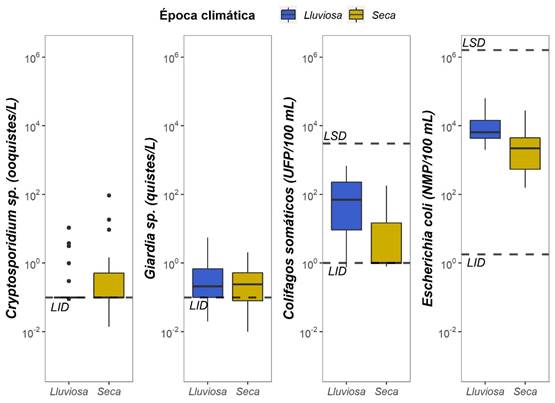 En referencia a la influencia climática en el comportamiento de las variables microbiológicas analizadas, se encontraron diferencias significativas entre la época lluviosa y la época seca para colifagos somáticos y E. coli. Estas observaciones coinciden con lo previamente informado, donde el aumento en la precipitación tiene una estrecha relación con el aumento en la concentración de estos microorganismos; además, se ha descrito que el incremento en la precipitación tiende a tener una mayor capacidad de arrastrar partículas sedimentables y microorganismos hacia los cuerpos de agua (Cizek et al., 2008). Este patrón se observó en este estudio, donde los microorganismos indicadores se encontraron en mayor concentración en época lluviosa (Figura 4). Contrariamente, la detección de Cryptosporidium sp. y Giardia sp. fue más frecuente en época seca; sin embargo, no hay diferencias estadísticamente significativas entre ambas épocas climáticas, por lo cual, es posible que la principal fuente de estos protozoarios sean descargas puntuales, mientras que su menor concentración durante la época lluviosa se podría atribuir a su dilución tras el aumento del caudal producido por la precipitación, lo cual concuerda con lo descrito por Schreiber et al., (2015) que altas concentraciones de parásitos como Cryptosporidium sp. y Giardia sp. pueden asociarse principalmente a descargas directas de aguas residuales. En resumen, es probable que la fuente contaminación entre Cryptosporidium sp. y Giardia sp. sea diferente a la de colifagos somáticos y E. coli, puesto que no presentan el mismo patrón estacional; por ello, la influencia de patrones temporales, como el clima, o espaciales como el uso de suelo, la vegetación y geomorfología tienen una influencia diferente entre los microorganismos estudiados (Figuras 2,3 y4).