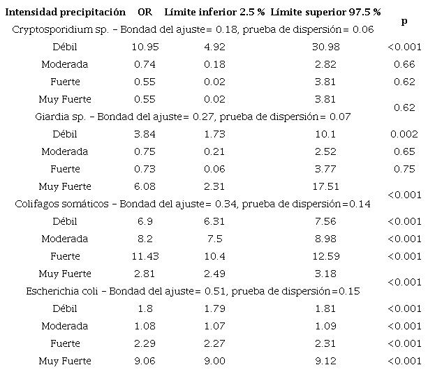 Para evaluar la relación entre la intensidad de precipitación veinticuatro horas antes del muestreo (categorizada previamente) y la concentración de Cryptosporidium sp., Giardia sp. colifagos somáticos y E. coli, se aplicó una regresión de Poisson bivariada. El análisis fue realizado utilizando el software R con la función glm (generalised linear models) para el análisis de variables continuas en modelos múltiples. Posterior al análisis, se calcula el coeficiente exponencial de la regresión de Poisson para el cálculo de las razones de momios (odd ratio).