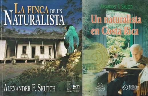 Como naturalista, además de las aves y las plantas, estudió ampliamente los animales silvestres y sus hábitats, y plasmó sus observaciones en artículos y libros. De interés especial para Costa Rica son: Un naturalista en Costa Rica (Skutch, 2001) y La finca de un naturalista(Skutch, 2017) (Figura 2). El primero recoge muchos de sus recorridos por el país y sus observaciones respecto a la naturaleza. En el otro reflexiona sobre los animales, la geografía y la ecología de su finca Los Cusingos. Ambos aportan información importante acerca de la naturaleza de Costa Rica, así como también, una perspectiva sobre su vida cotidiana como naturalista.