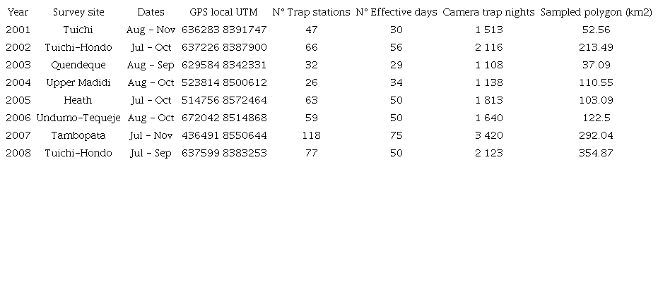 A total of 488 camera trap stations were placed on the ground, generating an effort of between 1 107 and 3 419.29 trap nights per sample site, and covering polygons of between 37.09 to 354.87 km2 (Table 1).