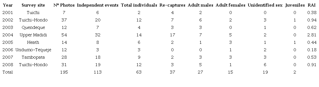 A total of 63 jaguars were identified: 27 adult males, 15 adult females, 1 juvenile male and 1 juvenile female, and 19 adults of unidentified sex. Tuichi-Hondo and Alto Madidi were the sampled sites with the highest number of captured individuals (12 and 15 individuals, respectively) (Table 2).