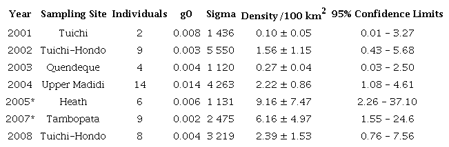 Tuichi-Hondo had the highest calculated densities with both estimation programs, and there was an increase from 0.52 to 2.34 jaguars / 100 km2 between 2002 and 2008.