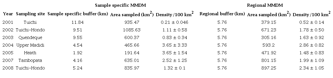 We observed that when using the MMDM, CAPTURE densities are closer to those calculated with SCR. For example, Alto Madidi has the highest MMDM density with CAPTURE (2.86 ± 0.8 jaguars / 100 km2) and the highest number of recaptures, and SCR produced very similar density estimates: 2.2 ± 0.8 jaguars / 100 km2 (Figure 2). These results suggest that sites with enough recaptures, produce similar density estimates for both analytical methods. However, in places where there are not enough recaptures, spatially explicit estimators tend to produce population densities with very high confidence limits. For example, at Heath and Tambopata, SCR derived density estimates of 9.16 ± 7.5 and 6.2 ± 4.9 jaguars / 100 km2, as compared to CAPTURE estimates of 1.48 ± 0.8 and 1.9 ± 1.1 jaguars / 100 km2 (Table 3). We believe that the regional buffer employed by us, permitted more robust density estimates when comparing with the ones that use a polygon buffer obtained within the specific trapping campaign, procedure followed by the majority of published CAPTURE density estimates (Maffei et al., 2004).
