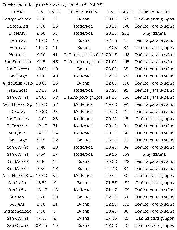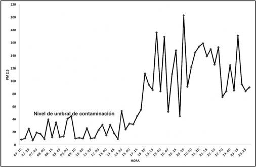 De acuerdo a la medición del material particulado registrado en los distintos puntos del muestreo, se pudo detectar que la franja horaria de 17.00 a 00.00, tuvo las concentraciones más altas de contaminantes (Cuadro 1), los cuales son desfavorables para la exposición al aire libre, o realizar actividades físicas de varias maneras.