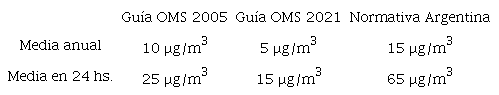 La contaminación a partir de material particulado tiene la potencialidad de conllevar efectos sanitarios incluso en concentraciones muy bajas; por ello de manera reciente la OMS sugirió en sus directrices las concentraciones más bajas posibles, con los siguientes valores: 5 μg/m3 de media anual, y 15 μg/m3 de media en 24 hs 1(OMS, 2021). Por otro lado, el Programa de las Naciones Unidas para el Medio Ambiente, afirma que la incineración de plásticos genera gases tóxicos que son liberados en la atmósfera, así como también furanos, dioxinas, bifenilos policlorados (PCB) mercurio, etc., lo que representa una amenaza (United Nations Environment Programme, 2019). Los contaminantes tóxicos de la basura plástica son considerados disruptores endocrinos implicados en una multiplicidad de complicaciones para la salud (United Nations Environment Programme, 2019; Verma et al., 2016).