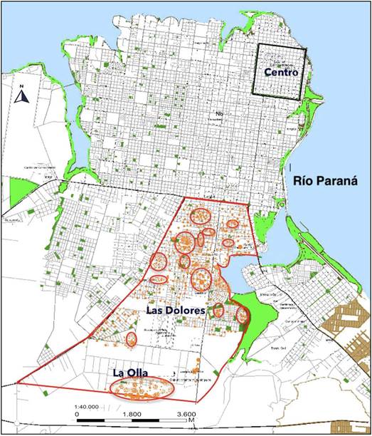 En el área de Las Dolores, hay una mixtura de barrios para sectores medios y barrios populares donde residen familias pobres. Las zonas más críticas estudiadas fueron: el complejo habitacional A-4, San Onofre, San Lorenzo, San Marcos, Lapachitos, San Lucas, Hermoso, San Jorge, Francisco de Asís, y Nazareno. Además, en los asentamientos los hábitats son precarios (carencia de infraestructura y servicios, contaminación de arroyos y pequeños basurales), en ellos la quema es un problema crónico, ya que hacia el interior de estos no suele haber calles internas y el servicio de recolección no llega, lo que condiciona que muchos de sus residentes se autogestionen la eliminación de la basura.