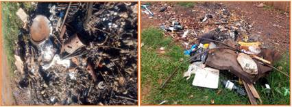 De acuerdo con las observaciones y registros de campo, se ha podido constatar, la existencia de pobladores que realizan quemas de modo reiterado en lugares fijos, aun disponiendo del servicio de recolección de residuos. Las quemas más frecuentes detectadas mezclan biomasa (restos de podas, ramas y hojas de árboles) con residuos inorgánicos muy variados (botellas de plásticos, envoltorios de PVC, metales, vidrio, cartón, cuero, hule, fibras, cerámica, madera pintada, goma espuma y textiles). La Figura 4 ilustra dos lugares de quemas frecuentes detectados.