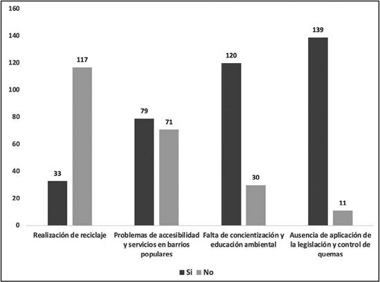 Con base en las encuestas realizadas, la investigación pudo encontrar la presencia de varios factores que, probablemente tienen incidencia en el aumento de la contaminación por quema de basura, a saber: a- la ausencia de aplicación de la legislación y control sobre el problema; b- la falta de programas de concientización y educación ambiental (en sectores populares); c- problemas de accesibilidad y servicios en barrios populares; d- escasas prácticas de reciclajes (Figura 5. Una situación que en la actualidad se complejiza en función del contexto de expansión urbana en el área sur de la ciudad, así como de la producción de nuevos envoltorios propios de la sociedad consumo.