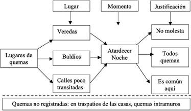 A partir de las entrevistas realizadas en los distintos vecindarios se pudo conocer que muchos residentes, que realizan prácticas de quemas, consideran a las veredas, terrenos baldíos y calles poco transitadas como espacios idóneos para quemar. Entre los argumentos sostenidos en el relato de las personas entrevistadas se encuentran algunas categorías como: “en la vereda no molesta”, “la calle no se usa”, “nadie pasa por ahí”, “es normal quemar aquí”, “no hace mal a nadie”, “quemamos de noche”, “el humo no molesta”. Por otro lado, con respecto a los momentos del día en que queman, 20 entrevistados han manifestado hacerlo al atardecer y en las noches. La Figura 6 presenta un esquema de las categorías analizadas en la manipulación o eliminación de la basura por medio de fuego. Un análisis que brinda pistas para interpretar el fenómeno de las quemas como una práctica cultural, común y hasta cierto punto normalizada en muchos vecindarios. En las zonas estudiadas, con frecuencia, las humaredas son visibles, del mismo modo que las cenizas de los sitios de quema a la vera de las calles (Figura 7).