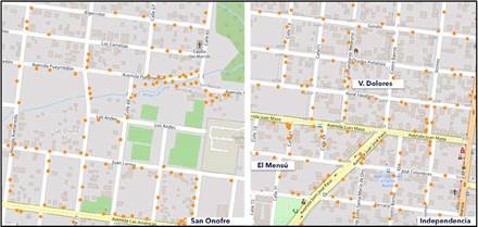 El relevamiento en la zona de Las Dolores abarcó los 32 barrios que conforman el distrito, en los cuales se han detectado 4 713 lugares de quema frecuentes, como en calles, veredas, y otros espacios públicos. Las quemas se han detectado tanto en barrios para sectores medios, como en barrios populares, siendo en los asentamientos pobres y sus alrededores donde se han relevado más lugares o focos que quemas. La Figura 3 muestra los puntos naranja correspondientes a lugares de quemas detectadas y los círculos rojos conciernen a las áreas más críticas, por reiteradas quemas, presencia de humo y niveles altos de PM2.5. Por otro lado, el relevamiento también ha detectado quemas que realiza el sector comercial, concretamente: 24 talleres de automóviles, 52 despensas, minimercados o kioscos de barrios y 9 empresas distribuidoras de alimentos. Quemas que se realizan próximas al predio, en baldíos adyacentes o esquinas poco transitadas.