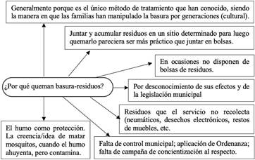 En función de la diversidad de los materiales que conforman la basura: plásticos, metales, caucho, gomaespuma, cuero, electrónicos, vidrios, cartón, papel, envoltorios diversos y su mezcla con biomasa, la problemática de las quemas y las emisiones se vuelve aún más compleja. Lo anterior indica que la polución, vinculada a las quemas, es uno de los problemas más serios del ambiente urbano en la periferia, lo que genera riesgos y potenciales costos para la salud pública. El conjunto de estas circunstancias requiere que el municipio, en el corto plazo, genere políticas de control y supervisión en los barrios. Se entiende que erradicar esta problemática es difícil, pero puede controlarse y mitigarse.