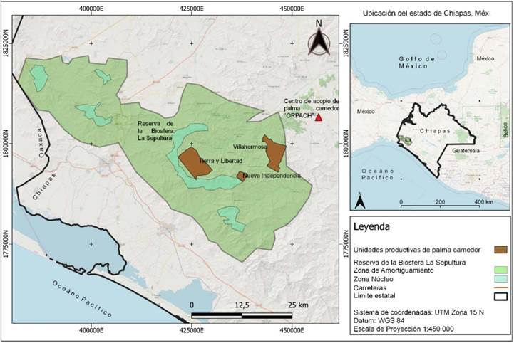 Esta investigación se llevó a cabo en tres comunidades localizadas en el estado de Chiapas, México: Tierra y Libertad, Nueva Independencia y Villahermosa. En el Apéndice 1 se presentan las características socioeconómicas y políticas de las tres comunidades de estudio. Estas localidades están ubicadas dentro de la Reserva de la Biosfera La Sepultura (REBISE) (Figura 2). La REBISE es un área protegida declarada en 1994. Tiene una superficie de 167 309 ha (Cano, 2019).