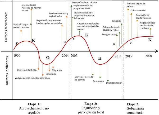 En el Cuadro 1 se describen los eventos de cambios y crisis de cada una de las tres etapas del manejo, y que explican dos ciclos de renovación adaptativa y el comienzo de un tercer ciclo. Las fases de explotación (r) y conservación (K) en los tres ciclos se caracterizan principalmente por los procesos de reorganización y participación social, la formación de capital social y humano de los grupos productores de palmas y por la disponibilidad del recurso natural (palmas Chameadorea quezalteca) a través de la implementación de modos de producción tecnificada y sustentable. Estas fases se desarrollaron a través de procesos y mecanismos relativamente lentos y acumulativos a través del tiempo (seis décadas). Las fases de liberación (Ω) y reorganización (α) en las etapas 1 y 2 (Cuadro 1) se caracterizan por la presencia de cambios y crisis recurrentes en la organización social y el mercado de las palmas. Sin embargo, estos eventos permitieron a los grupos de productores y a los actores gubernamentales responder diferenciadamente en la planificación, toma de decisiones e implementación de normas y estrategias locales, ajustadas también a las reformas de las leyes federales en el manejo de las palmas.