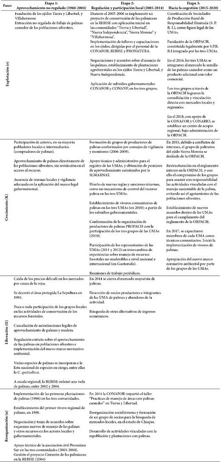 (Resultados): Se identificaron tres etapas representadas por ciclos adaptativos: 1) una explotación no regulada de poblaciones silvestres de palmas (1960-2004); 2) regulación y participación local en el manejo y conservación de las palmas (2005-2014); y 3) cogestión y reorganización comunitaria para el aprovechamiento sustentable de las palmas (2015-2020).