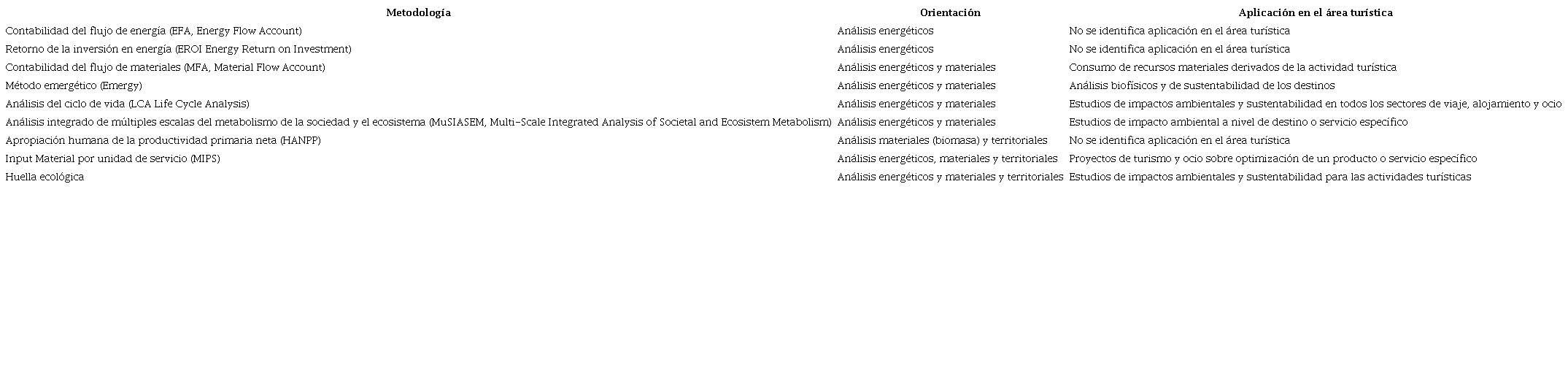 De las metodologías investigadas, algunas que ya han sido aplicadas en el área turística (método emergético, MIPS, LCA y huella ecológica) han aportado herramientas para la evaluación de indicadores sobre la apropiación, transformación, consumo y desecho de recursos. Esto permite comprender mejor las interdependencias entre el bienestar social y los servicios físicos proporcionados por el metabolismo de la actividad turística con miras hacia la sustentabilidad. Sin embargo, algunas otras (EFA, EROI y HANPP) no han despertado el interés de las investigaciones en esta área.