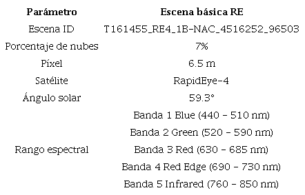 Se utilizó una imagen multiespectral (escena básica RE) del satélite RE-4 capturada el 4 de enero de 2010 (Cuadro 1). Esta fue localizada en el archivo de imágenes de Planet en el año 2014 (https://www.planet.com/products/explorer/). Este insumo presentó un tamaño de pixel de 6.5 m, un nivel de procesamiento 1B y una resolución radiométrica de 12 bits (Planet, 2016).