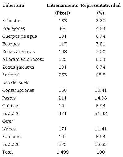 Una vez interpretados los patrones y definidas las categorías que conformaron las principales CT-US de la zona de estudio, se definieron regiones de interés (ROI, por sus siglas en inglés) para agrupar y clasificar los píxeles espectralmente similares y separables entre categorías (Cuadro 3). Tomamos como referencia lo establecido por Congalton (1991), quien aconseja un número mínimo de 50 puntos por categoría (para áreas menores a las 400 000 ha) para realizar de forma práctica la definición de puntos confiables para una clasificación de categorías de CT-US. En este caso, relacionamos los pixeles espectralmente separables en cada categoría para definir los ROI que correspondió a 1 499 pixeles y se dio mayor énfasis a aquellos donde la categoría no fuera tan representativa.