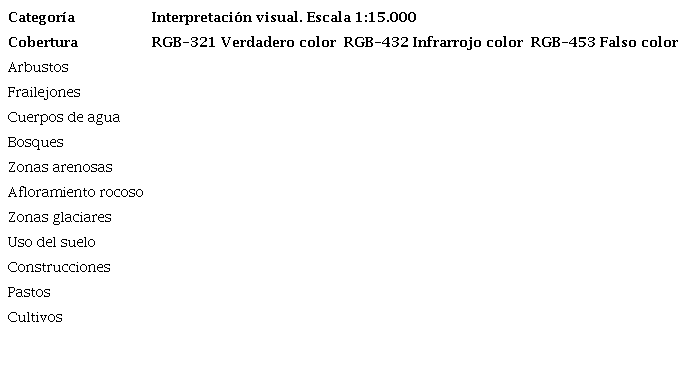 Se implementó las técnicas de interpretación visual descritas por (Melo y Camacho, 2005) donde se tuvieron en cuenta los criterios para la identificación de los elementos que componen la superficie de la imagen (tamaño, forma, color, textura, etc.). Adicionalmente, se crearon composiciones RGB en color verdadero (321), color infrarrojo (432) y falso color (453); esto, con el fin de resaltar particularidades adicionales de los elementos interpretados. Se determinó el comportamiento visual de 10 patrones identificables de CT-US en la imagen (Cuadro 2) donde se generó una descripción de las características que componen el paisaje en el área de estudio.