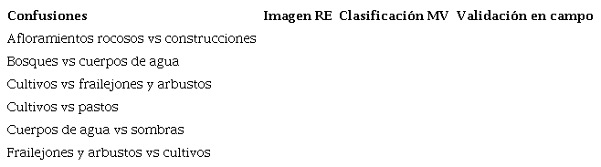 Se identificaron las principales confusiones por parte de la clasificación con el MV (Cuadro 5). Se pudo observar que las zonas con construcciones, principalmente las áreas urbanas, tendieron a clasificarse como afloramientos rocosos; esto, debido principalmente a la similitud espectral. Del mismo modo, algunos parches de bosques presentaron confusión con cuerpos de agua, a causa de algunas sombras reflejadas por la posición topográfica; algunas zonas de cultivos presentaron confusión con respecto a zonas de frailejones y arbustos, lo cual se comprobó a partir de los diferentes estados de desarrollo de los cultivos que generaron una similaridad espectral entre estas categorías. Por otro lado, los pastos presentaron confusión con algunas zonas de cultivo, principalmente por los diferentes estados de desarrollo de ambas categorías; algunos cuerpos de agua presentaron confusión con sombras reflejadas por la posición topográfica; zonas de frailejones y arbustales de alta montaña presentaron confusión con respecto a cultivos; sin embargo, esto se descartó en campo, debido a las condiciones de altura sobre el nivel del mar donde se desarrolla esta cobertura natural.