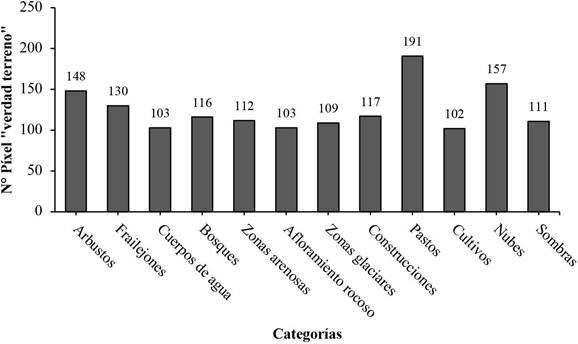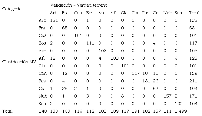 Figura 6); se generaron 1 499 nuevos píxeles (diferentes de los píxeles de entrenamiento) basados en las recomendaciones de Congalton (1991) y las categorías que produjeron mayor incertidumbre; por otro lado, se quiso trabajar el mismo número de píxeles tanto para la clasificación como para evaluar la precisión.