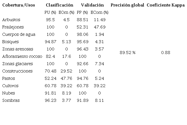 El análisis de fiabilidad de la clasificación supervisada obtuvo una precisión global del 89.52 % (Cuadro 7); sin embargo, los pastos y los cultivos mostraron una omisión del 47.76 y un 39.22 % respectivamente, este es el mayor error por omisión en la clasificación mediante el algoritmo MV. Asimismo, el mayor error por comisión lo obtuvo los frailejones con un 47.69 %, categoría de mayor dificultad para la clasificación. Además, se obtuvo un Kappa de 0.88, lo que indicó, en términos generales, una buena clasificación.