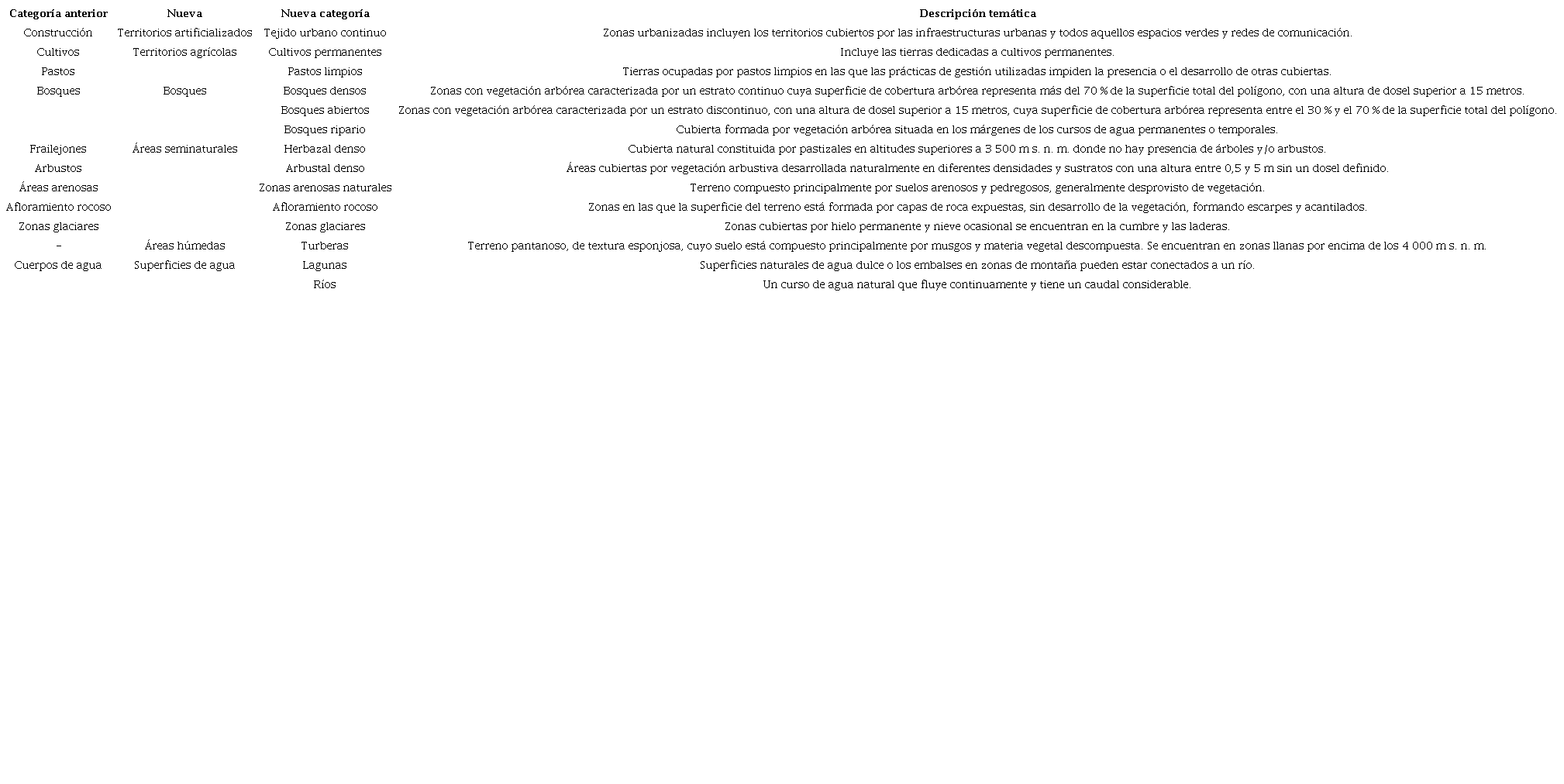 Se incluyeron seis unidades y 14 nuevas categorías con base en el esquema de clasificación de la leyenda nacional de coberturas para Colombia (Cuadro 8). Se determinaron dos nuevas categorías para la unidad de bosques, una nueva unidad de zonas húmedas que representó los ecosistemas de turberas Andinas y una categoría de ríos, ya que fueron fácilmente ubicables en la imagen RE, este nuevo esquema de clasificación constituyó el paisaje andino para el área de estudio.